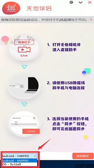 4、设备列表中成功识别到手机后,点击无他伴侣上的【同步】按钮就可以看到手机直播助手与电脑端无他伴侣的同步画面了。