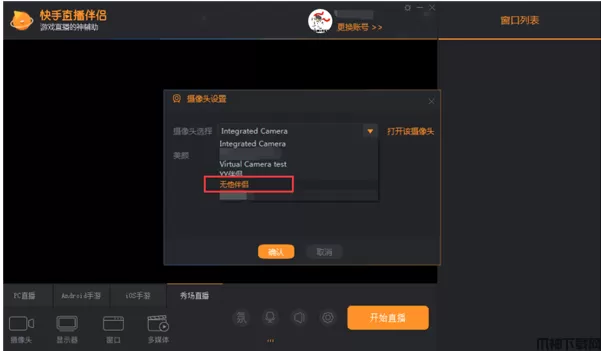 5、画面同步成功后,此时就可以在各个直播平台的摄像头列表中选择【无他伴侣】,即可使用无他伴侣摄像头用来直播啦。