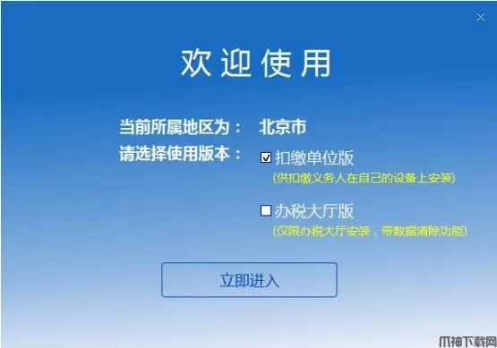 点击安装完成界面上的【立即体验】(或点击桌面“自然人电子税务局(扣缴端)”快捷方式),进入版本选择界面。除了在办税大厅终端上部署的客户端选择“办税大厅版”外,其他均选择默认选项,即“扣缴单位版”。