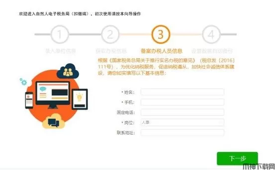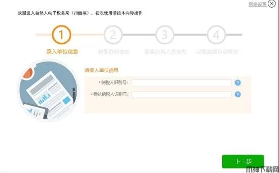 在[纳税人识别号]/[确认纳税人识别号]的位置输入扣缴单位的纳税人识别号,已进行过三证合一的单位则输入统一社会信用代码,点击【下一步】,即可完成注册的第一步。