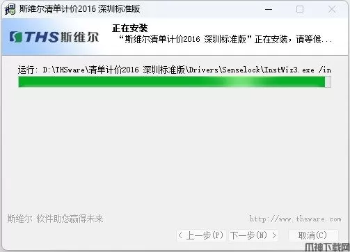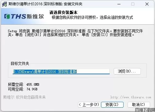 3、软件默认的安装路径是D:\THSware\清单计价2016 深圳标准版,如需安装到其他盘符下请点击“更改”,选后路径后点击确定,然后点击下一步。