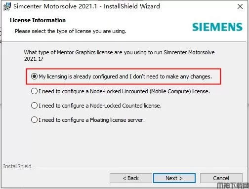 3、在安装程序中,当询问许可证配置时,选择: “我的许可已配置,无需更改”