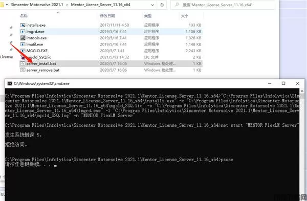 8、以管理员身份运行“ Mentor_License_Server_11.16_x64 \ server_install.bat”,然后等待新服务“ MENTOR FlexLM Server”安装并启动