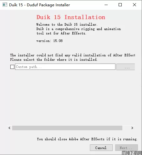 1、在本站下载好数据压缩包后进行解压,解压出文件夹。找到可执行文件“Duik_15.06_installer.exe”,双击:Duik_15.06_installer.exe安装包后出现以下弹框,找到自己AE的安装路径(必须事先安装好AE