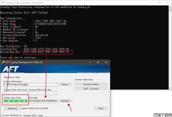 15、将刚才复制的Site Code粘贴到窗口中,点击回车键,生成一组注册信息,将Encrypting Key复制到AFTCrypkeyManagementUtility.exe的site key输入框中,点击【Validate】按钮即可完成注册