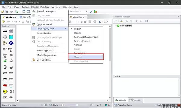 16、运行AFT Fathom 11,默认为英文界面,用户可以通过Tools-Output Language,选择Chinese,将软件更改为中文版!