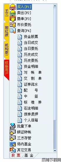 在功能树的下方,以标签的形式,列出了系统支持的交易品种,如股票、开放式基金、融资融券、股指期货等交易。
