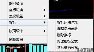 3、使用技巧:用户选中指标后,在弹出的〖右键菜单〗→〖指标〗中还可以进行“调整指标参数”、“修改指标公式”等操作,完成对指标的参数和公式进行微调,以达到优化技术指标的效果。
