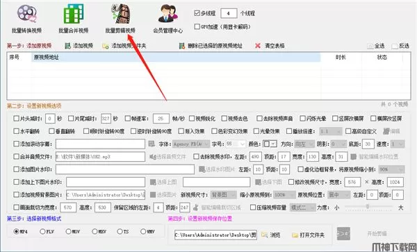 2、批量合并视频界面:第一步里导入的视频可以和第二步里的每一个视频合并,然后按照要求输出视频格式。
