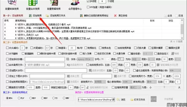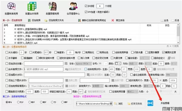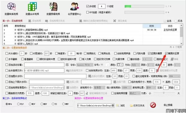 3、视频批量剪辑功能:包括视频裁切、给视频加背景图片、视频消音、视频加背景音乐、虚化边框背景、横竖屏视频转换、去掉视频帧数,添加水印,打马赛克,增加视频特效等几十个功能。