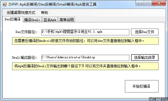 a、使用“Dex反编译”功能,先将Apk进行反编译,得到所有的Smali文件(可以直接选择apk文件或解压出来的dex文件,工具会自动识别)