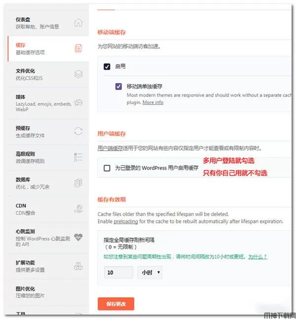 如果网站有多个用户注册登录使用,就勾选【为已登录的 wordpress用户启用缓存】,如果只有你自己管理的网站就不要勾选;
