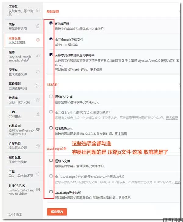 这里的设置并不是每个都可以勾选的,你设置完后要对网站前后台打开检查是否正常,如果有异常就取消某项勾选,保存后再测试知道问题消失为止。因为每个主题引用的 css、js、html内容都不同,所以要多测试几次才能知道能不能勾选。