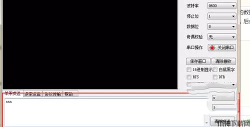 5、界面简介: 上面的黑色窗口是显示接收的数据的。 在发送栏中写入要发的数据,后点击发送就可了,注意是否有空格,回车等键。