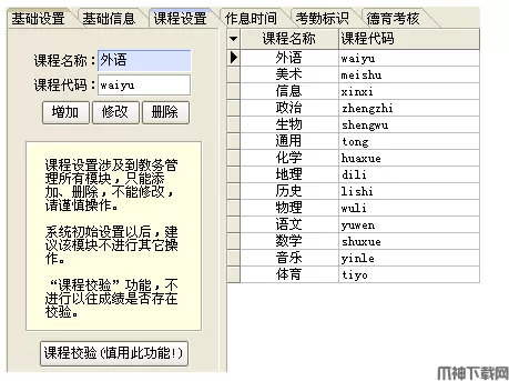 (注:课程设置涉及到教务管理所有模块,只能添加、删除,不能修改,请谨慎操作;系统初始设置以后,建议该模块不进行其他操作;“课程校验”工呢个,不进行以往成绩是否存在校验。)