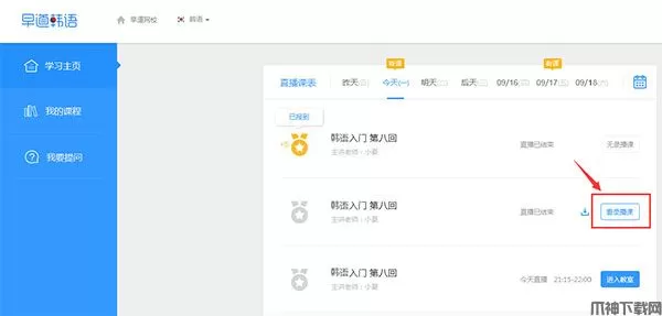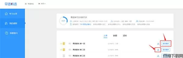 3、进入录播课页面后,在想学习的课程后面点击“下载”或“看录播课”