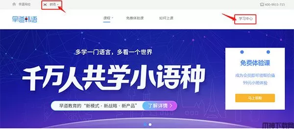 1、登录网站,进入“学习中心”页面,选择语种(韩、德、西、法、英)