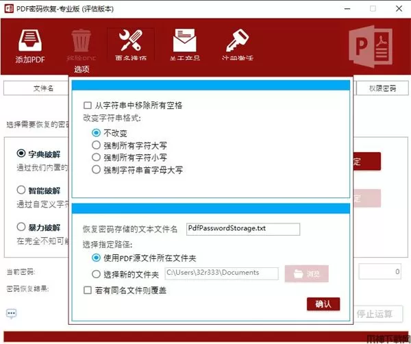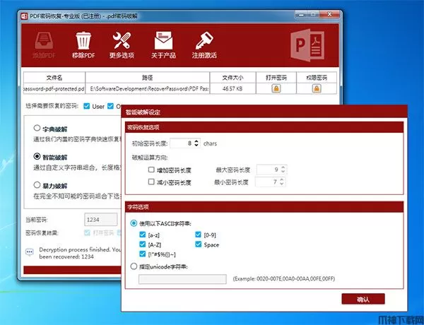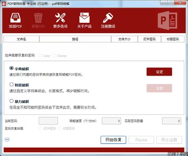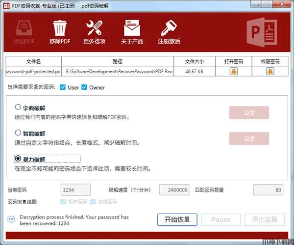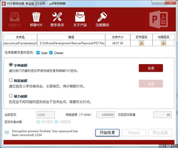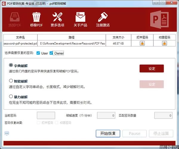 PDF密码恢复工具是一款非常专业有用的密码破解清除软件,可以帮助你打开一些网上找到的却打不开的加密PDF文档,也可以帮助你恢复已丢失或遗忘的PDF档案的“打开”密码和“权限”密码。软件支持三种方式对PDF加密文件进行密码恢复“字典”、“智能”、“暴力”。破解完成的文档可以使用各种PDF浏览器查看器进行查看,阅读无限制。通过PDF密码恢复工具独有的多核CPU,多线程及GPU加速技术,能够快速地进行PDF密码的恢复与破解。需要的朋友欢迎下载使用!