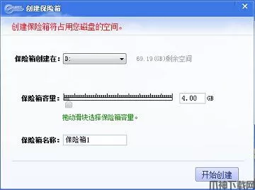 第二步:选择保险箱所存储位置(如:磁盘D),拖动滑块设置保险箱大小(或在文本框中输入指定大小),设置保险箱的名称(也可以使用保险箱默认的名称)。请根据您的实际磁盘大小,合理设置保险箱的大小