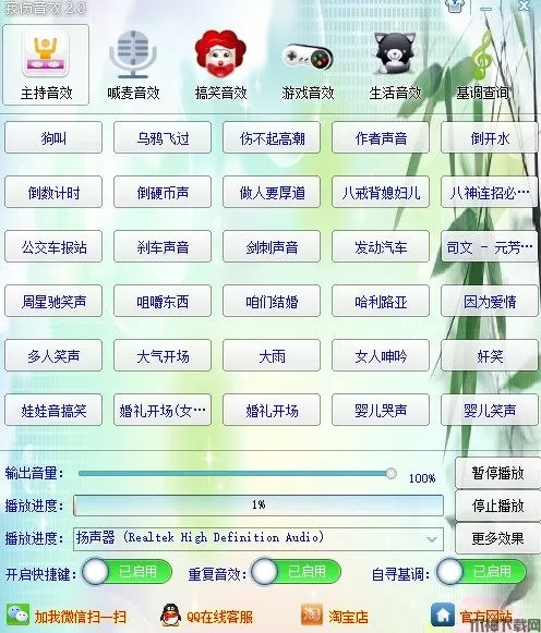 寂伤音效是一款非常给力的音效软件。该款软件包含了多款特色直播背景音效,随时随地都能够播放背景伴奏音效,支持各种音效快捷键设置,界面整洁、容易上手。它提供了主持音效、游戏音效、搞笑音效、喊麦音效等一系列功能,让用户随时使用专属的音效,增添气氛。可以在网络K歌的过程中加入掌声、笑声、喝彩、尖叫等各种音效、营造播音气氛的网络主持人辅助工具。寂伤音效软件除了常用的经典音效、人物音效、热门音效等,还可以自定义增加自己的音效。拥有多种有趣的声音效果,让用户可以随意使用这些声效来为自己的直播进行气氛的渲染和烘托,支持设置快捷键,更方便的使用音效。有需要的朋友可以下载体验哦。