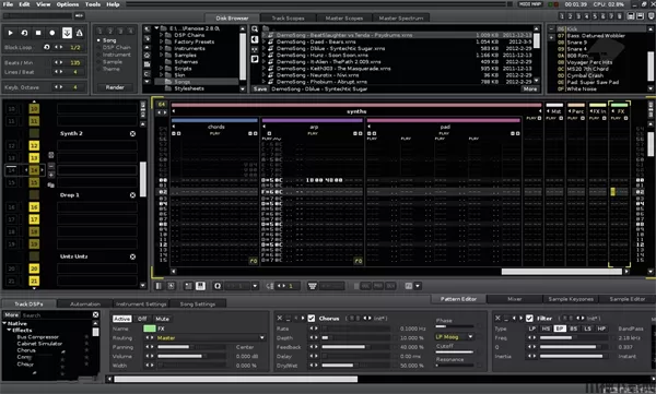 内置的采样器可以很容易地编辑和试听样品直接从Renoise没有应用程序之间切换。由于该模式矩阵,你可以在你的作文的模式和轨迹概述。所有的模式和轨迹跟踪到的块,可以移动、复制和粘贴轻松。