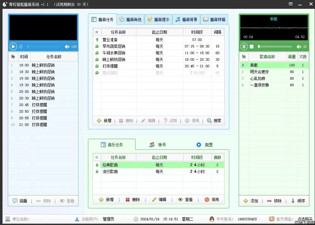可以按日期、星期或两者的组合来制定播音或音乐的播放计划,在这个基础上再按时间段编排不同的播放任务,既可以单次播放,也可以循环播放,任务一旦编排好,真正做到无人值守