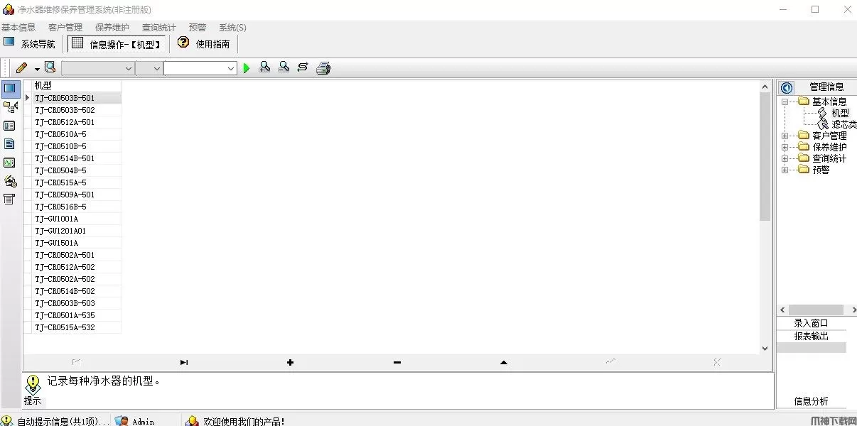 净水器维修保养管理系统官方版是一款功能强大、操作简单、绿色免费、界面清晰、实用性强、并针对净水器维修保养服务中心管理所设计的一款软件。净水器维修保养管理系统由基本信息、客户管理、保养维护、查询统计、预警五大部分组成,可以有效的记录每个客户的信息及安装时间,以及维修保养记录,其次,在操作流程上非常人性化,普通用户不需培训也能很快上手,支持数据与execel的导出与导入。净水器维修保养管理系统可以记录每个客户的信息及安装时间,以及维修保养记录,该何时到期保养提醒等信息,从而提高了净水器维修保养服务中心管理者的工作效率是一款有效的管理软件。是不是很心动啊,那还犹豫什么,赶快跟小编我一起下载吧。净水器维修保养管理系统,你值得拥有。