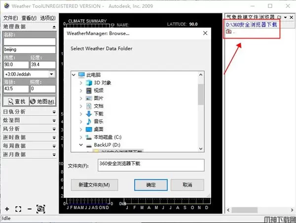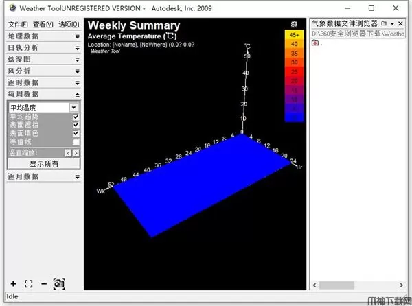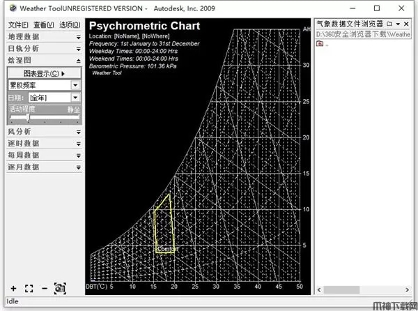 Weather Tool中文版还能提供常规气象数据查看和其数据转换,为了能够将用户更好的分析各种情况,你也可手动导入TMY、TMY2、TRY和DAT等气象数据格式。包括地理位置数据、日轨分析、焓湿图分析、风分析、逐时数据分析、逐周数据分析及逐月数据分析等功能模块,能够实现对能源效率及可持续设计完善的流程控制,节省时间和成本,提高建筑生态模拟效果,带给用户高效的分析体验。