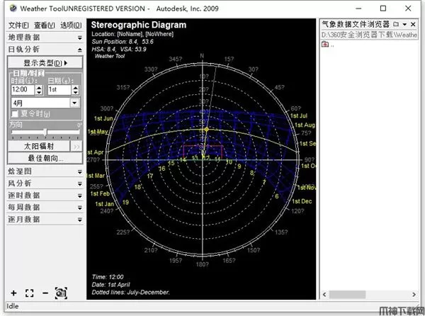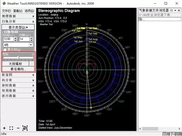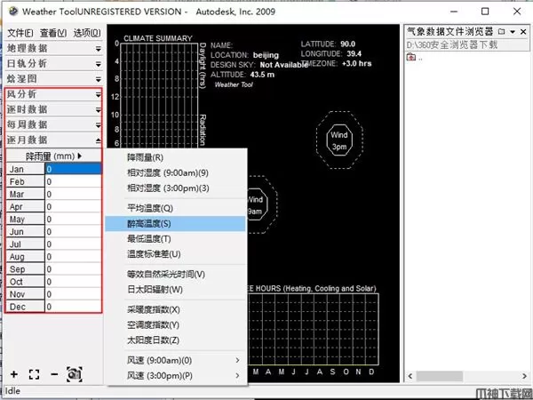1、在建筑设计的最初,通过使用 Weather Tool分析气象数据,可以直观的认识建筑基地所处地区的气象资料;