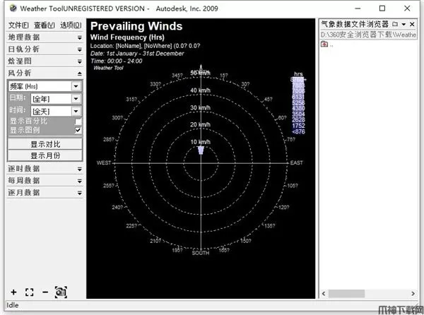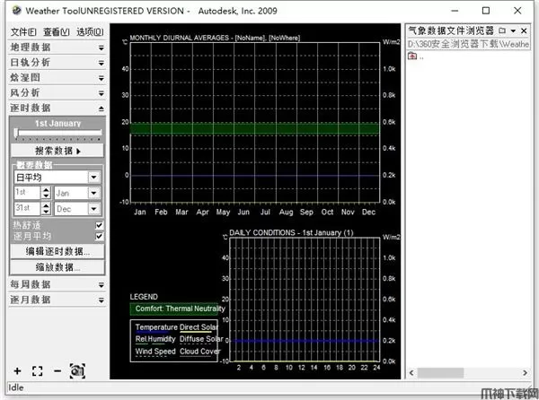 Weather Tool是一款可视化的逐时气象数据分析和转换软件,可用于直观的分析建筑基地所处地区的气象资料。软件充分吸收了Ecotect中的建筑生态与环境模拟分析理念,使用灵活,操作简单,可同时提供中国270个气象站的数据文件,能够独立完成生态建筑模拟开展的各种活动安排,高效、实用。Weather Tool能够告诉用户气象数据,进而了解到当地的热舒适性区域和建筑各朝向立面上的全年太阳辐射情况,借此计算建筑的朝向,运用到建筑平面设计和规划设计中。