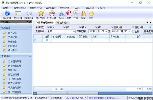 3、历史明细统计:与当日明细统计相对应,对于历史记账信息,在这里根据提供的查询功能,即可快速统计出所有的收支数据。可以根据需要查询不同类型的单据信息,并进行修改、删除操作。