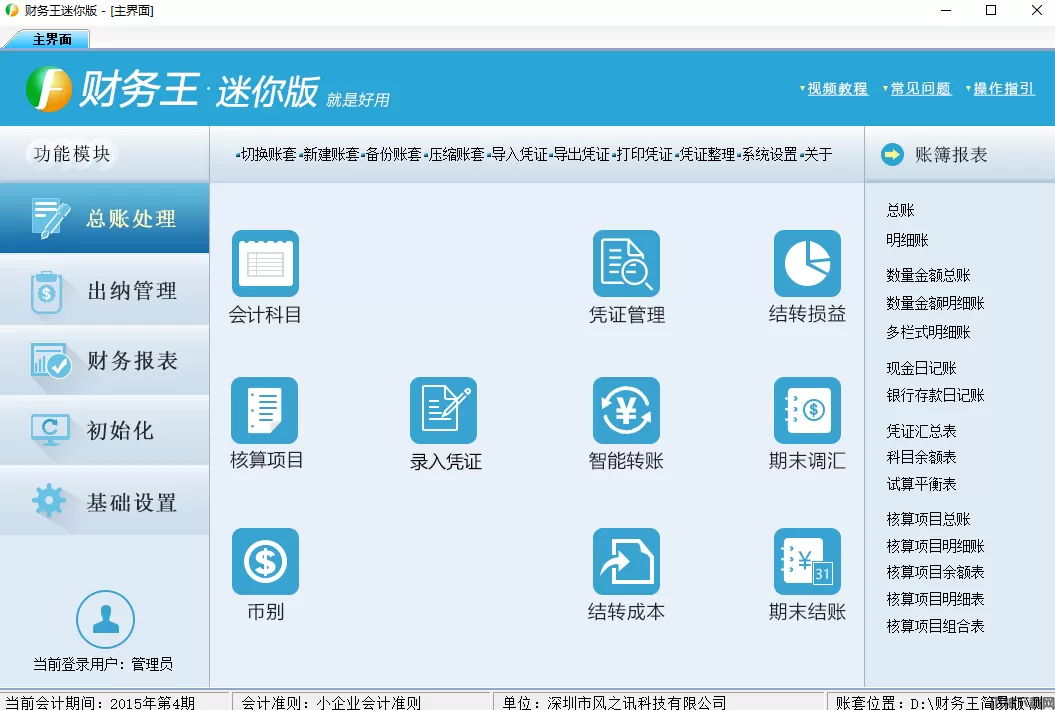 财务王迷你版版提供:会计科目、初始数据、录凭证、查凭证、删改凭证、打印凭证、结转损益、期末结账、期末反结账、导入初始数据、导入科目、导入凭证、凭证整理,审核过账、结转到新账套等主功能。账簿报表包含:总账、明细账、数量金额总账、数量金额明细账、多栏式明细账、凭证汇总表、科目余额表、试算平衡表、资产负债表、利润表和现金流量表。并预设资产负债表、利润表和现金流量表模板。产品状态栏显示【当前会计期间】、【会计准则】、【公司名称】、【账套位置】等信息,查看方便直观。