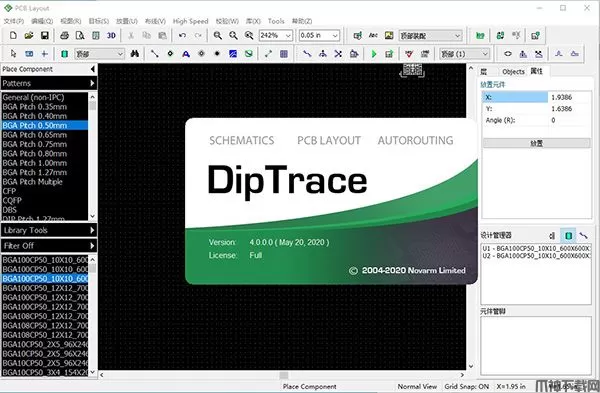 DipTrace 4是一款简单易用且专业强大的PCB设计工具,该软件采用直观的用户界面,具有市场上最短的学习曲线,可支持分层原理图、高速和差分路由、具有实时DRC检查的深入设计规划。除此之外,这款软件功能十分强大,支持手工和自动布线PCB设计、支持创建逻辑示意图并能输出网表到PCB板、提供pattern编辑器、支持组件编辑,全方位满足用户的使用需求。并且通过软件,你可以构建从简单的逻辑电路到高度复杂的电路板,可以在平面和3D形式下查看。同时DipTrace 4主要包括四个程序模块,包含PCB LayoutP、Schematic原理图、Pattern Editor模式编辑器、Component Editor组件编辑器,内置140000多个标准组件,7500多个套餐款式,可以方便快捷的进行pcb电路板的设计。