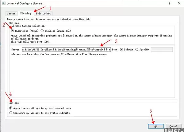 8、从开始菜单,运行配置许可证。选择“浮动”选项卡上,选择:企业, 输入ansyslmd.lic的完整路径,然后单击确定;