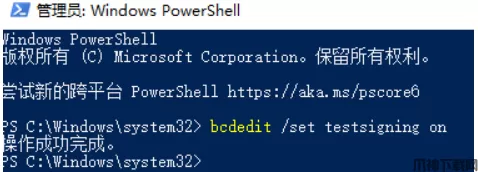 右键开始菜单,并点击windows powershell(管理员),打开电脑终端(管理员),在powershell窗口中输入 bcdedit /set testsigning on 然后回车,即开启win11测试签名模式,显示“操作成功完成”