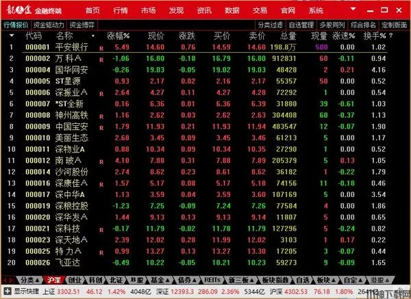 跌幅、量比、委比、成交金额排名。在综合排名中可以使用右键菜单选择查看不同的市场信息,同时可以按“3行3列”或“1行4列”的方式选择查看的方式。