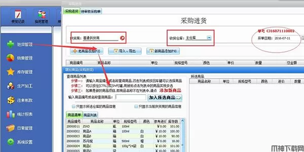 用户在首页可以点击进货管理,再点击采购进货就可以进入采购进货页面,可以输入供货商以及收货仓库,之后添加自己的进货商品