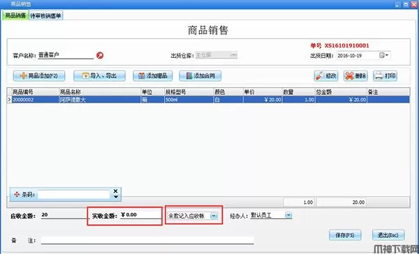 用户点击首页的销售管理,之后点击商品销售,即可进入页面,可以查看商品销售信息,包括金额员工等