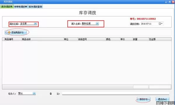 用户点击首页的库存管理,之后点击库存调拨,即可进入页面,可以将主仓库的货物库存调入需要的仓库,之后点击保存即可