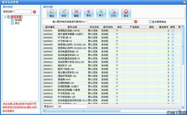 在配件列表中点击“增加”按钮打开增加配件界面,可以进行增加配件的操作。
