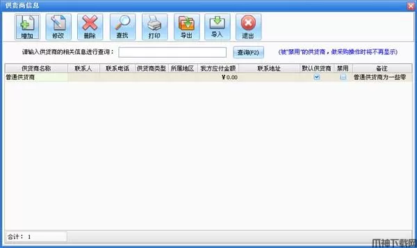 在系统设置模块中点击“供货商信息”按钮打开供货商信息窗口如图所示。在窗口中可以看到所有的供货商。点击“增加”按钮打开增加供货商窗口,输入供货商的信息,供货商名称不能重复。如果该供货商有期初金额就在“期初应收”后输入相应的金额。如果选择中“默认供货商”在采购进货和采购退货打开窗口的时候显示的为该供货商,默认供货商只能有一个。