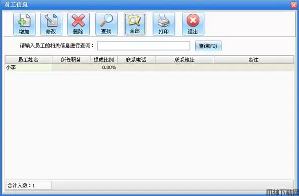 在系统设置模块中点击“员工信息”按钮打开员工信息窗口如图所示。在窗口中可以看到所有的员工。点击“增加”按钮打开增加员工窗口,输入员工的信息,员工名称不能重复。