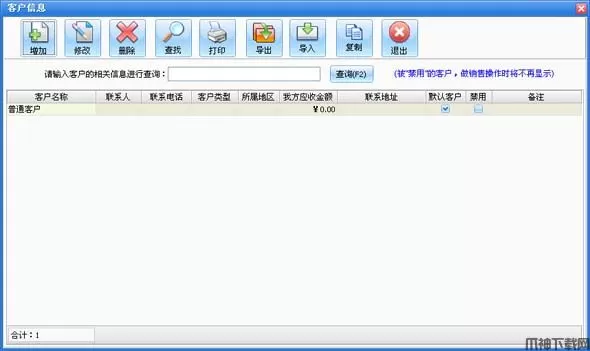 在系统设置模块中点击“客户信息”按钮打开客户信息窗口如图所示。在窗口中可以看到所有的客户。点击“增加”按钮打开增加客户窗口,输入客户的信息,客户名称不能重复。如果该客户有期初金额则在“期初应收”后输入相应金额。如果选择中“默认客户”在配件销售和顾客退货打开窗口的时候显示的为该客户,默认客户只能有一个。