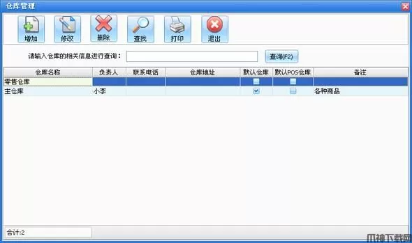 在系统设置模块中点击“仓库设置”按钮打开仓库设置窗口如图所示。在窗口中可以看到所有的仓库。点击“增加”按钮打开增加仓库窗口,输入仓库的信息,仓库名称不能重复。