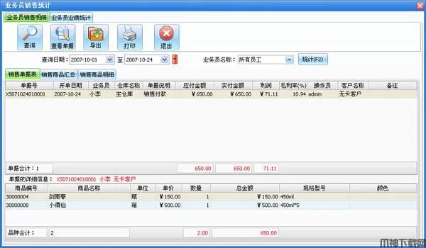 业务员销售明细:对业务员在不同时间段内的商品销售、退货,客户付款情况进行统计;