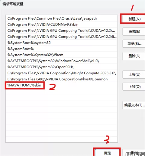 9、点击 “新建”,并添加以下路径:%JAVA_HOME%\bin,保存后点击确定。