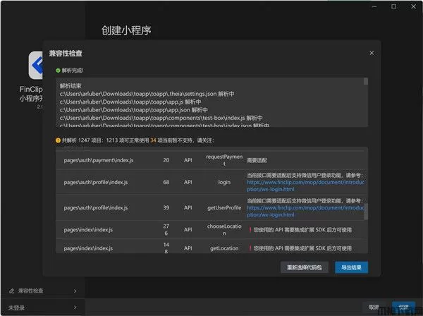 FinClip Studio 的兼容性检查功能会扫描代码的全部组件、API 调用,对于部分暂不支持或者需要适配的接口,会给出相应的提示。 image.png