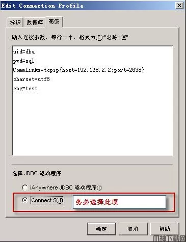一定要选择JDBC驱动程序为: jConnect5,其中:uid,pwd,CommLinks,charset,eng分别表示用户名、密码、iq服务器ip地址和端口、字符集、数据库服务器名称。