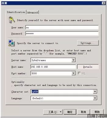 4、在上图中,在Server name列表中选择将要连接的Sybase ASE数据库,下面的Host name和Port number对应的是服务器条目的信息。User name和Password分别输入登录Sybase ASE数据库的登录账号和密码。在Character set列表中选择字符集为:cp936
