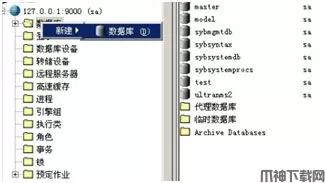 1、在上面的步骤中初始化了两个设备:Demo_dat和Demo_log,下面演示在这两个设备上面新建数据库Demo。在Sybase Central中左边文件夹列表中选中数据库,点右键,选择 新建 > 数据库